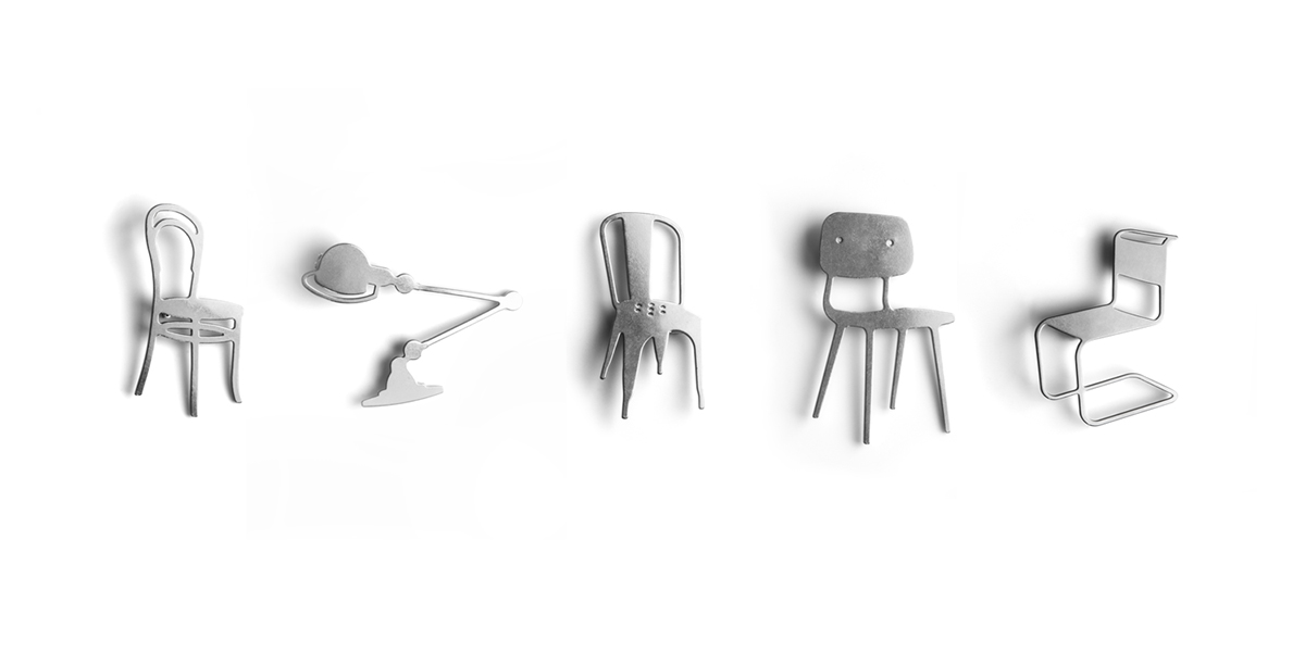 Chair No. 14 (Gebrüder Thonet), Chair S33 (Mart Stam), Jieldé Standard Lamp (Jean-Louis Domecq), Revolt Chair (Friso Kramer), Standard No. 4 (Jean Prouvé) and Tolix A Chair (Xavier Pauchard)